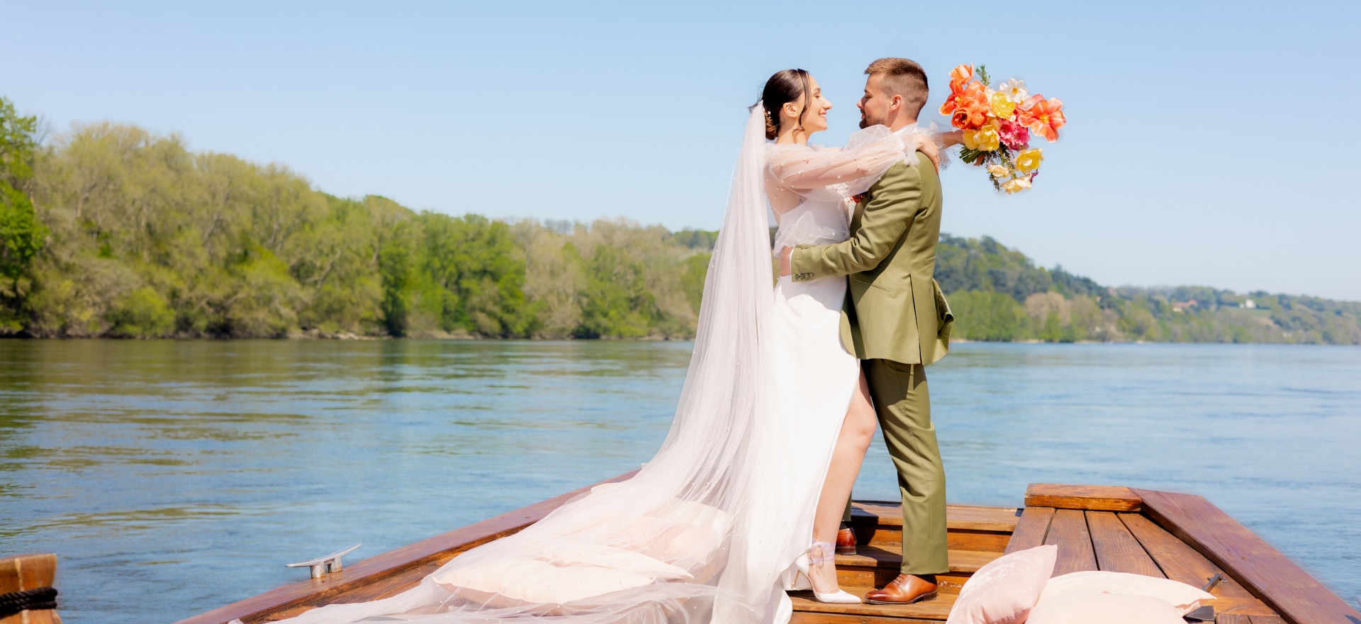 Une robe épurée et contemporaine, un costume olive, sobre et raffiné, habillent les mariés pour ce beau shooting coloré au fil de l’eau.